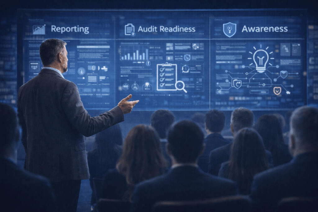 We provide regular reporting to senior management, maintain continuous audit readiness, and support internal and external audits (ISO 27001, E-ITS, NIS2, contractual audits). In parallel, we support awareness activities so that information security responsibilities are understood across the organisation.